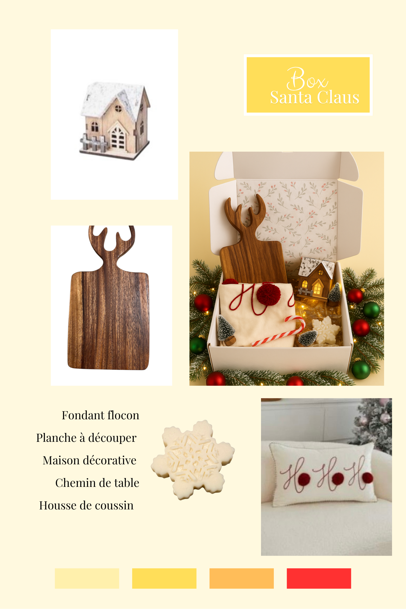À l’intérieur, découvrez une sélection élégante et festive de décoration cocooning : une housse de coussin , une bougie réconfortante artisanale , une petite maison décorative à led, une planche à découper élégante, un chemin de table raffiné.
